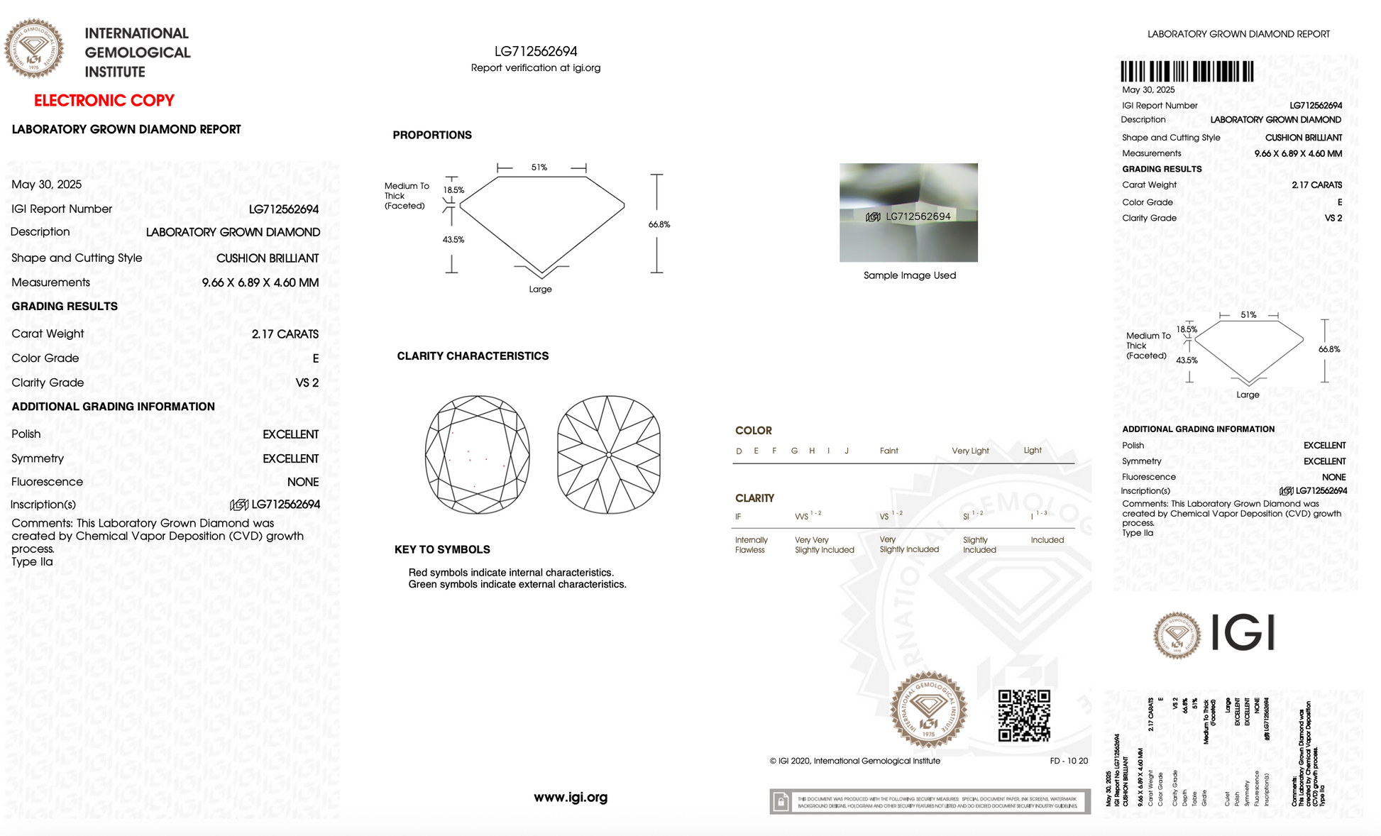2.17ct E VS2 IGI Certified Old Mine Cut Cushion Lab Diamond