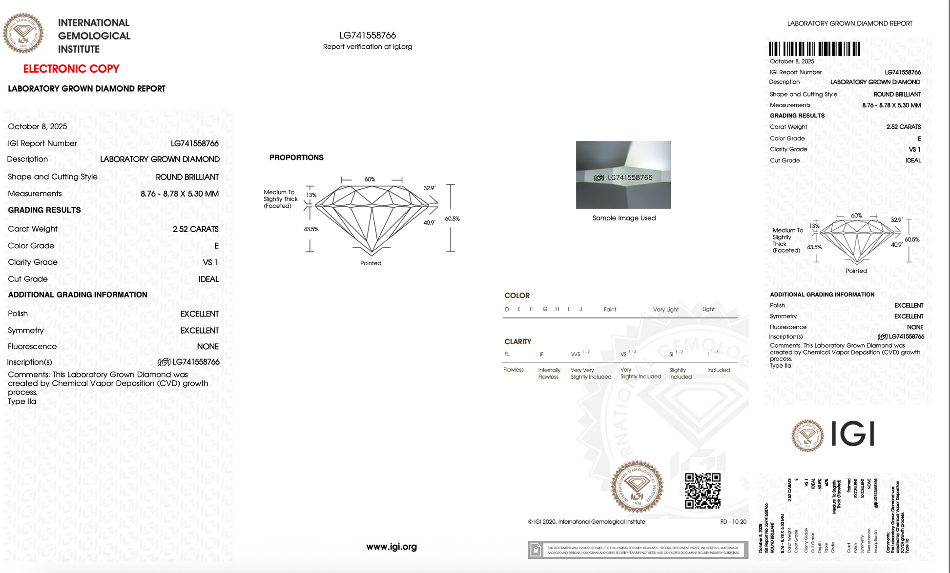 This classic engagement ring features a 2.52ct E VS1 round brilliant lab diamond, certified by IGI (LG741558766), set in a refined tulip-style basket with a soft cathedral rise. The result: a bright, airy solitaire that shows off your diamond from every angle.