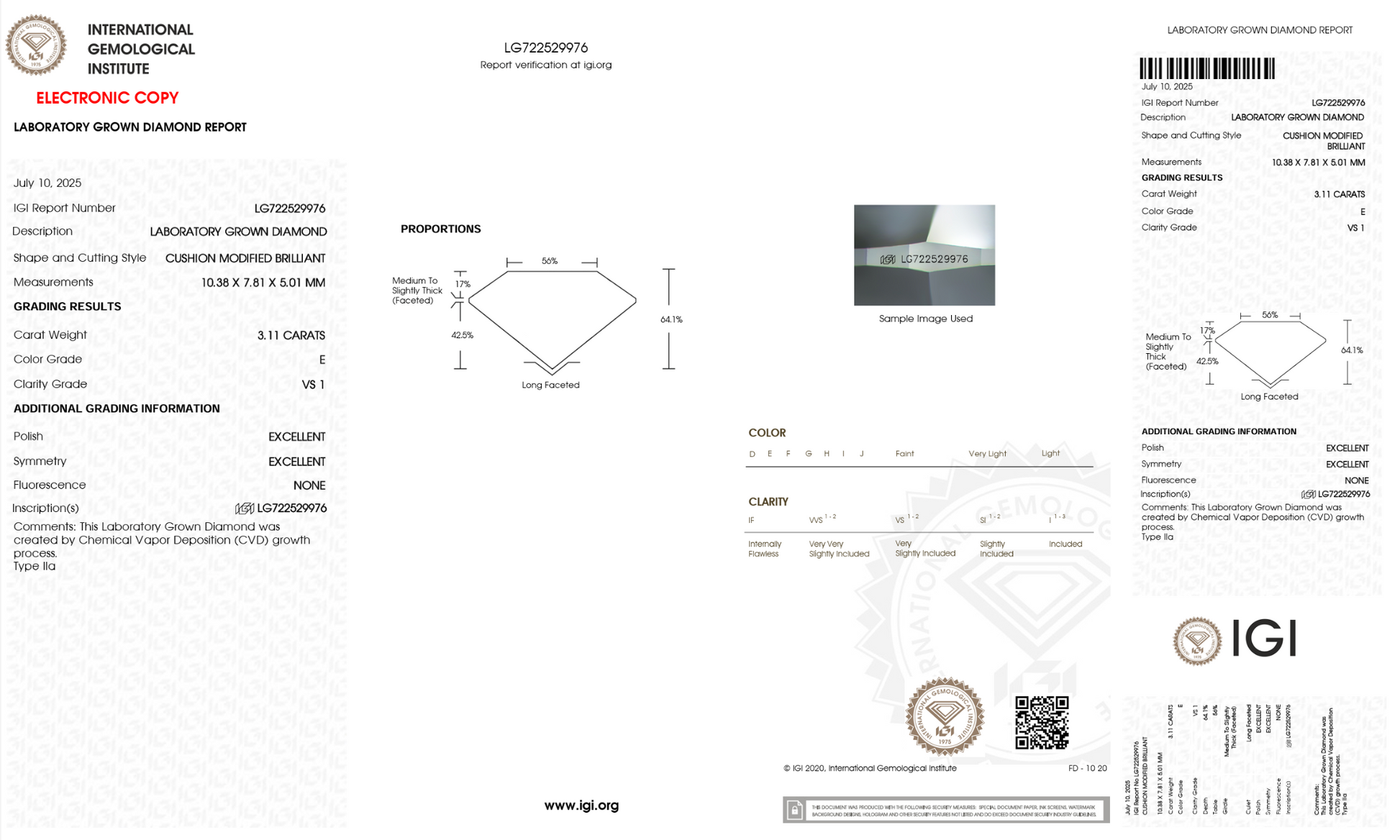 3.11ct E VS1 IGI Certified Old Mine Cut Cushion Lab Diamond