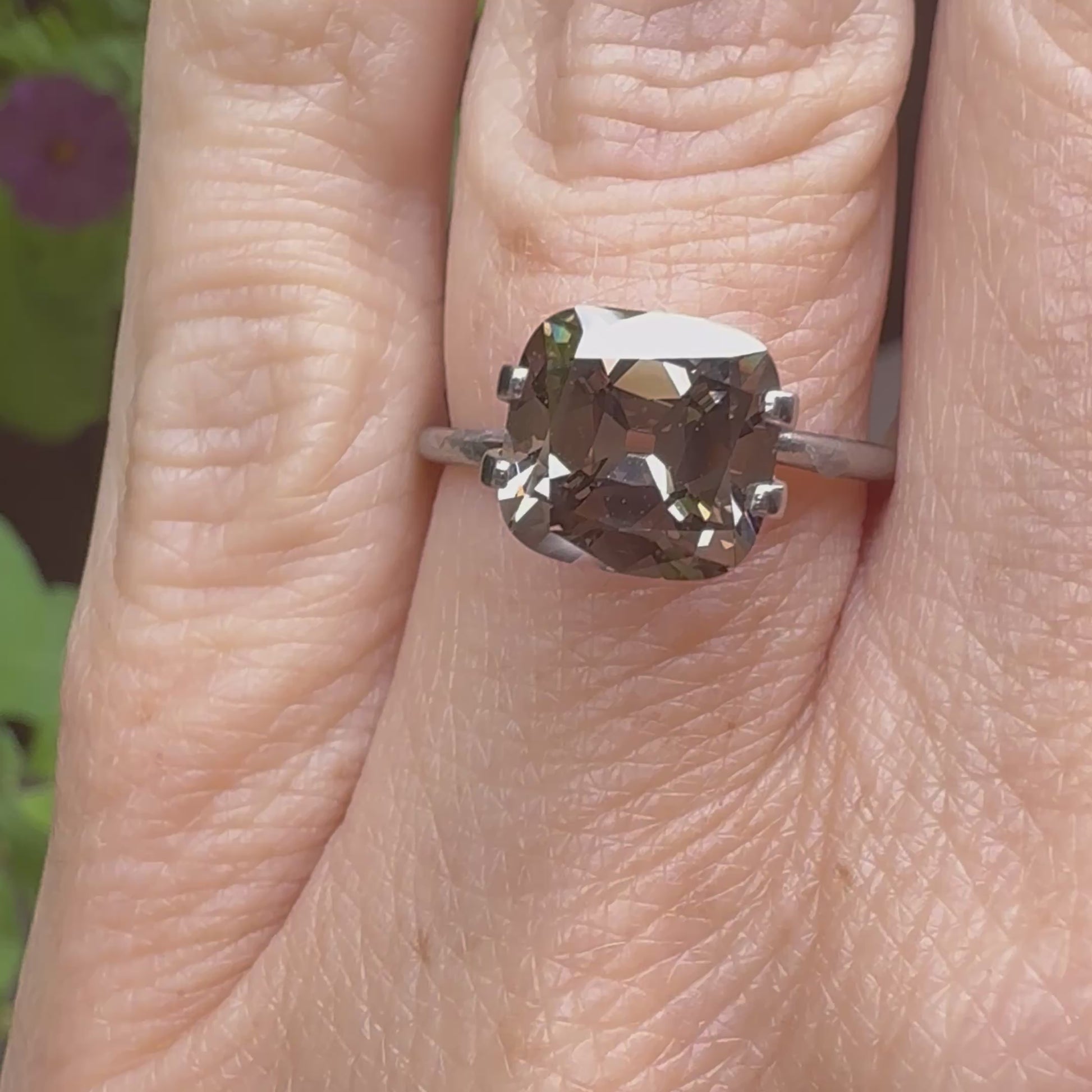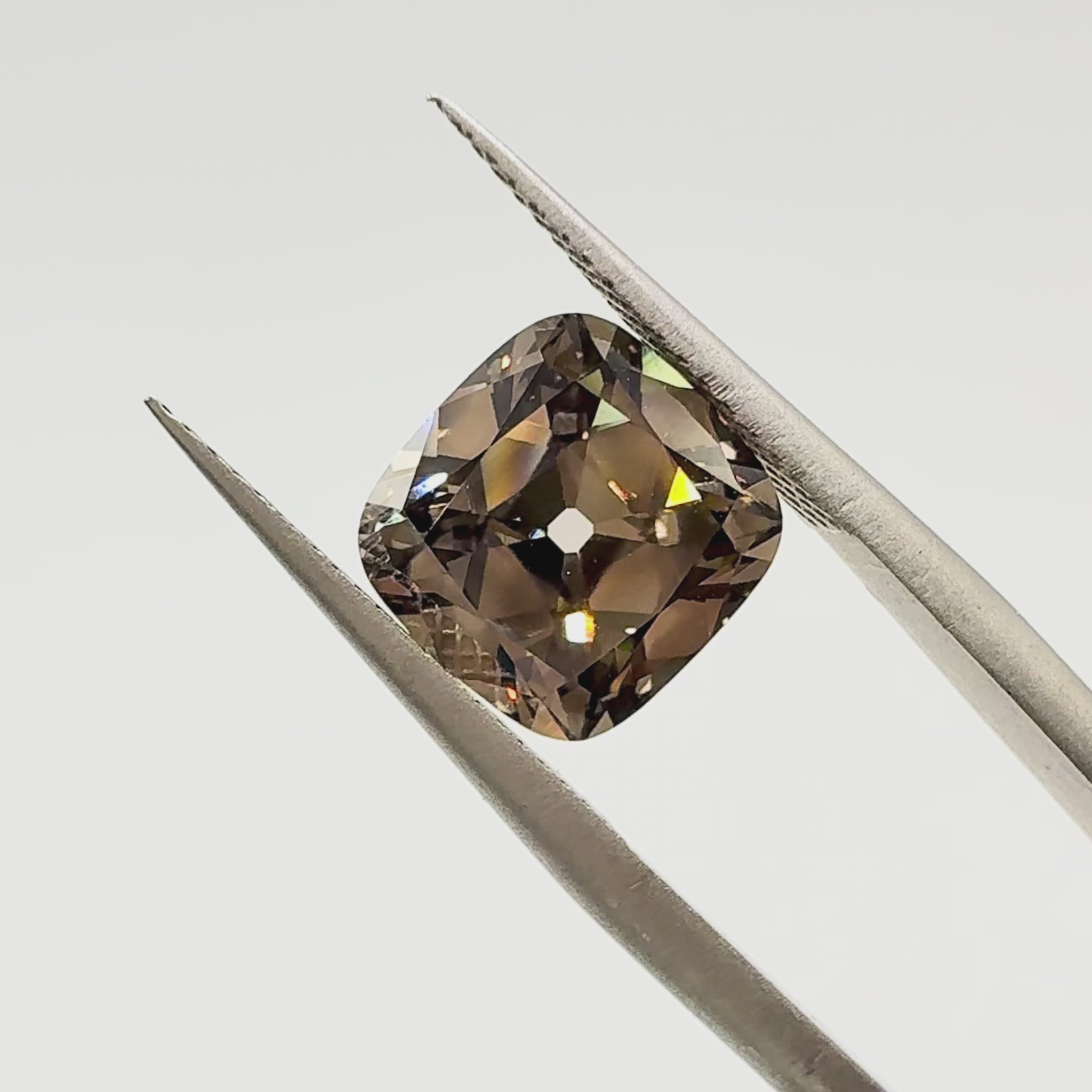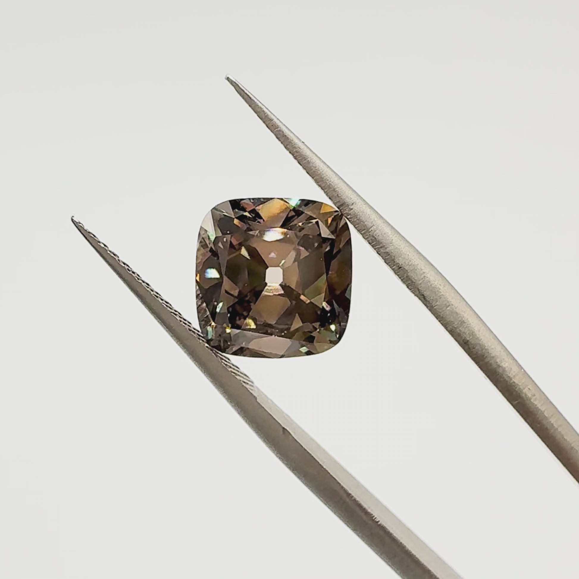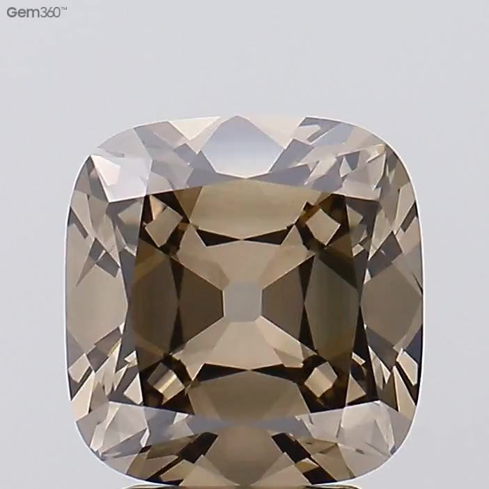 This coffee-colored antique cut cushion measures 8.80 x 8.50 x 5.10 mm, and is uncertified, but worth it if you're into chocolate diamonds. Would look amazing in a chunky, rich yellow gold setting.