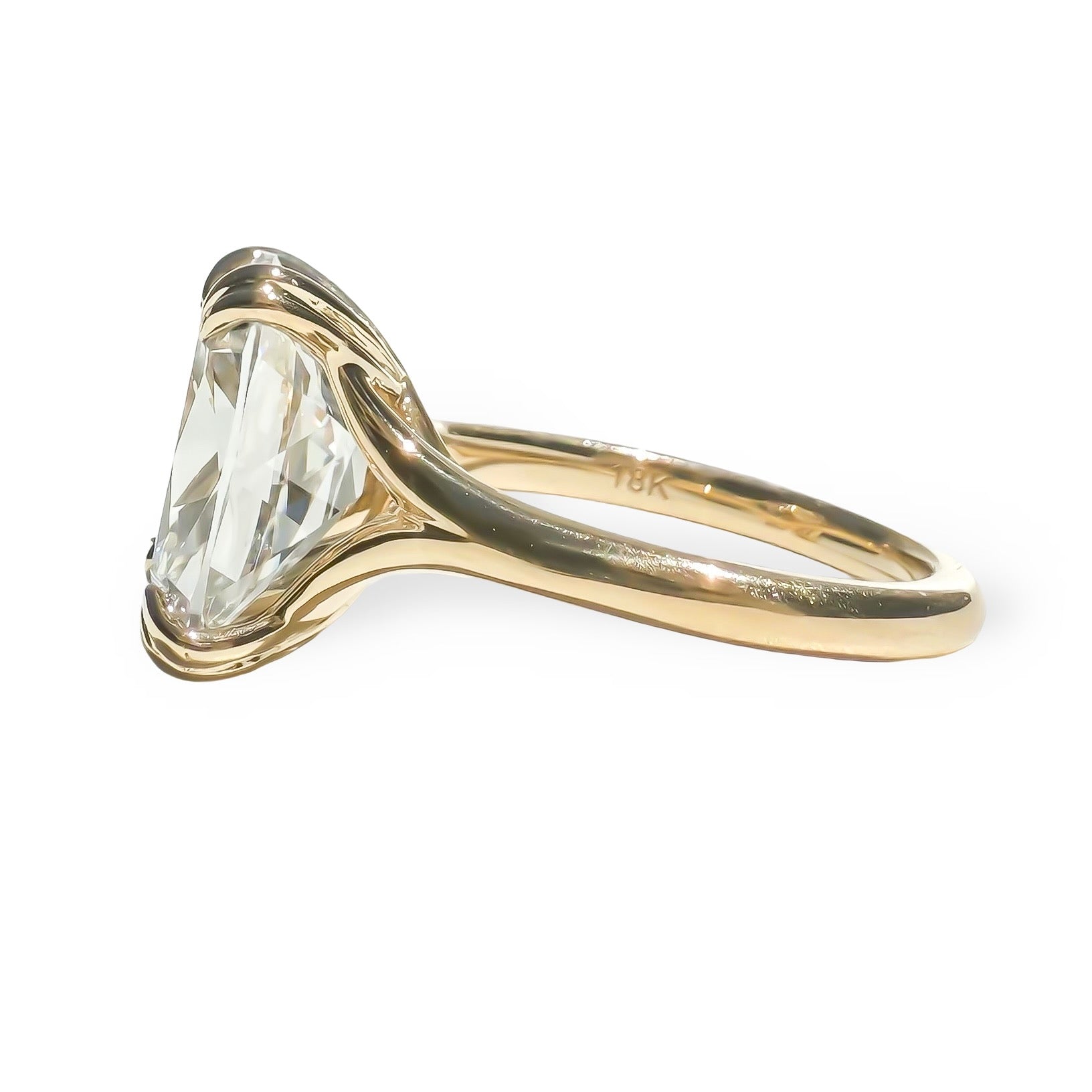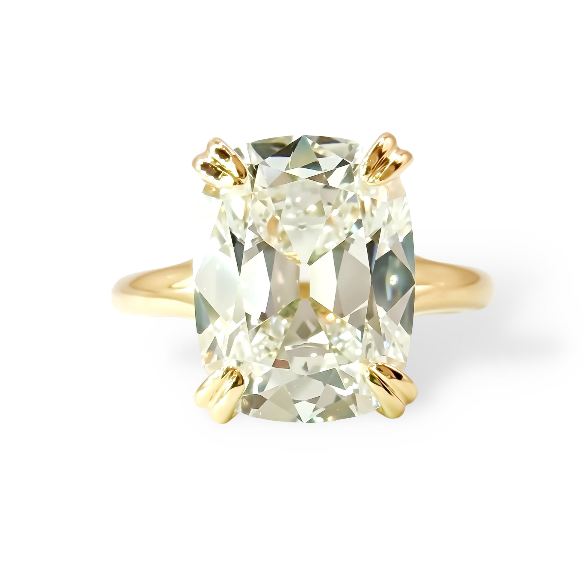 This gorgeous 4.47ct antique cut cushion diamond is as near to perfect as it gets, and it looked even lovelier when set in this gorgeous 18K yellow gold embrace ring.