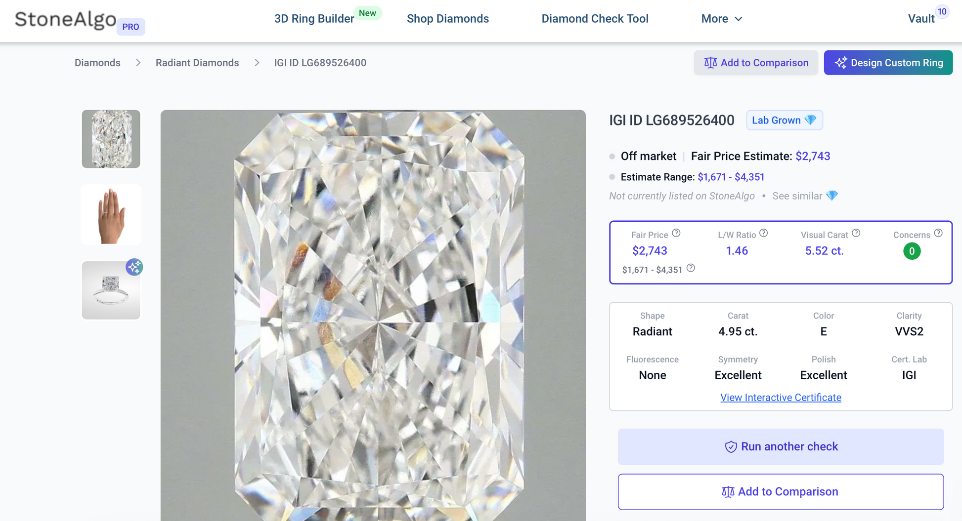 4.95ct E VVS2 IGI Certified Radiant Cut Lab Diamond