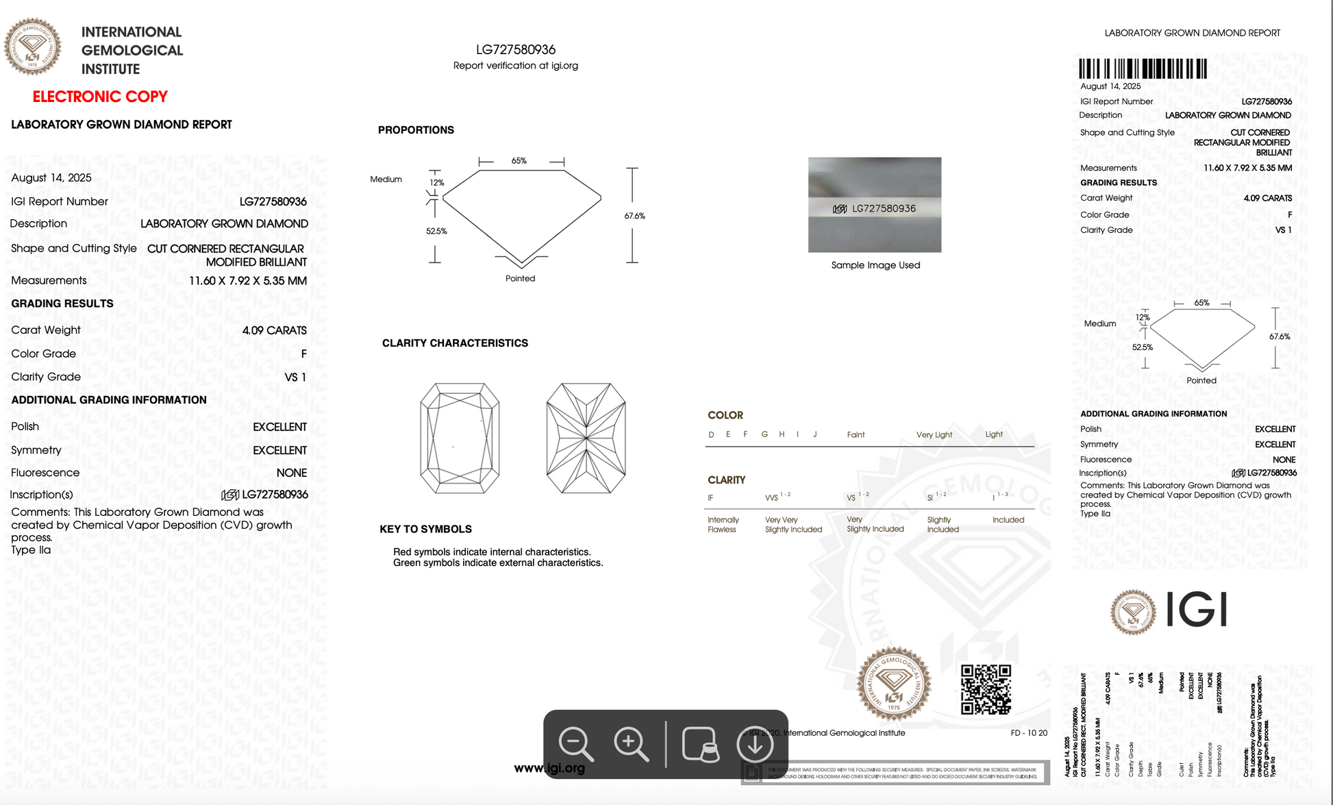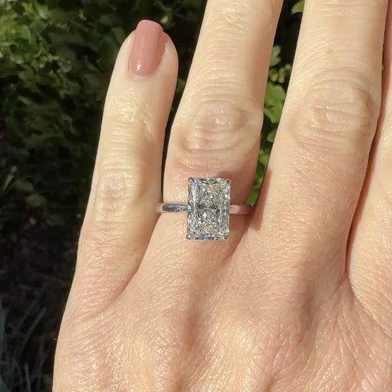 Nothing glitters like a radiant cut diamond. This sparkly 4ct radiant cut lab diamond, certified by IGI (LG727580936), is set in a uniquely swoopy pave basket with a soft cathedral rise. The hidden halo looks like it’s dripping off of the center stone.