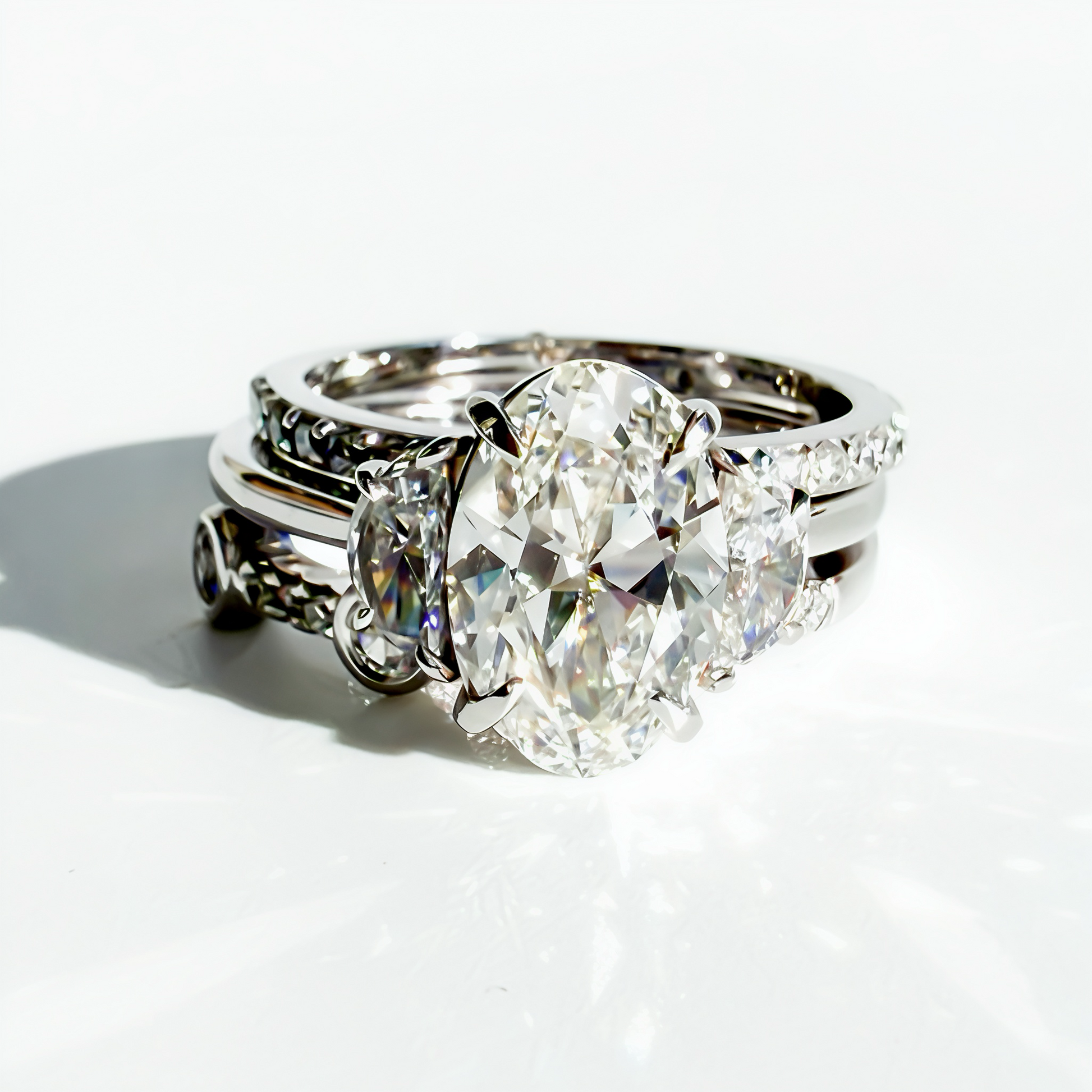 A refined take on the classic three-stone design, this ring features a stunning 2.58ct F VVS2 antique cut oval diamond at the center. Measuring 11.38 x 7.47 x 4.70mm with a graceful 1.52 length-to-width ratio, the oval offers a beautifully elongated presence on the hand. Flanking the center stone are two perfectly matched 3x6mm half-moon diamonds, adding balance and brilliance. Crafted in polished 14K white gold, the ring is designed to sit flush with most wedding bands for effortless stacking.