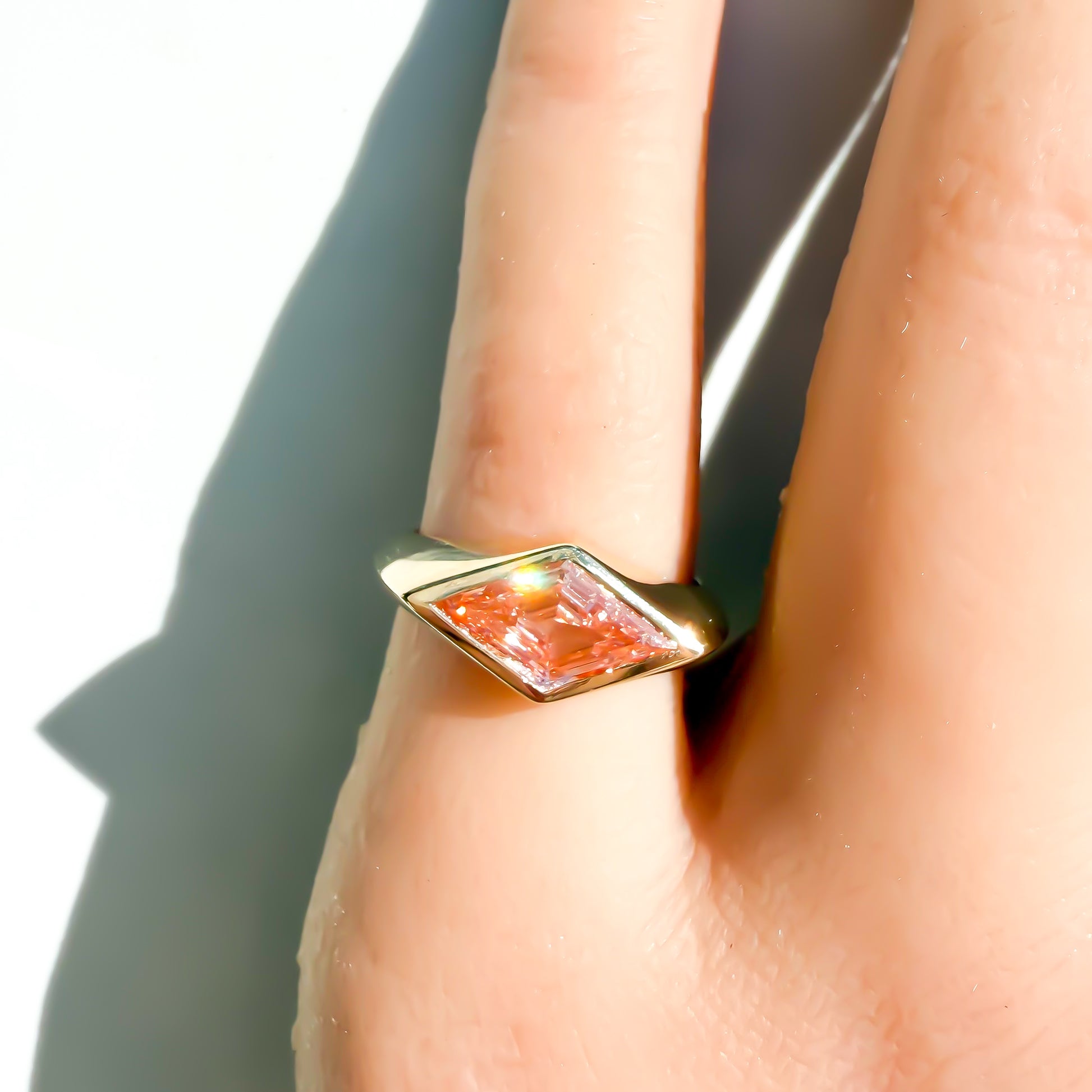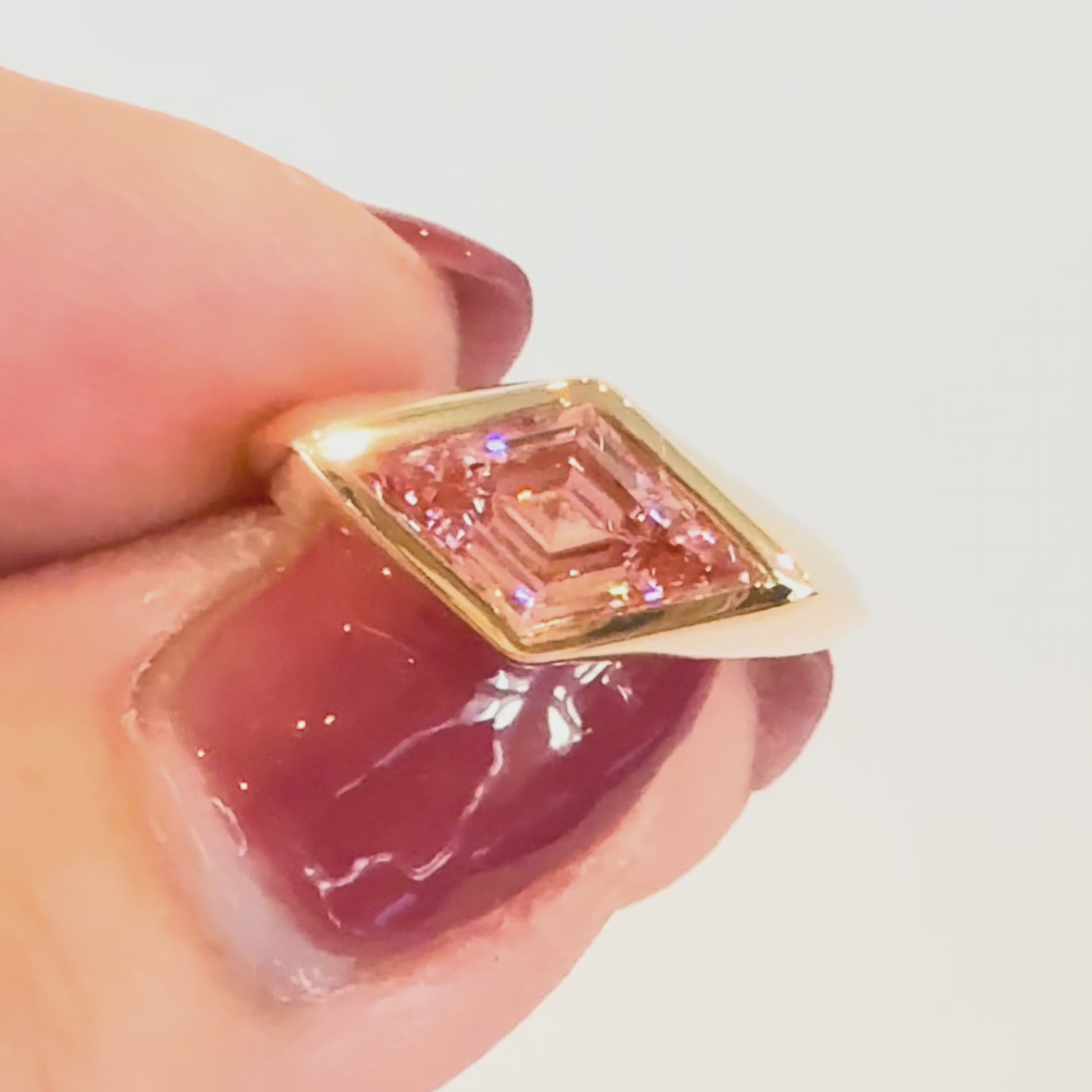 Bold yet refined, this chunky signet ring features a striking 1.12ct fancy vivid pink lozenge-shaped diamond with VS1 clarity. The geometric cut is set east-west into a knife-edge 14K yellow gold band, creating a modern silhouette with vintage undertones. A true statement piece, this design balances architectural structure with the rare beauty of a vivid pink diamond — perfect for collectors and lovers of unconventional luxury.