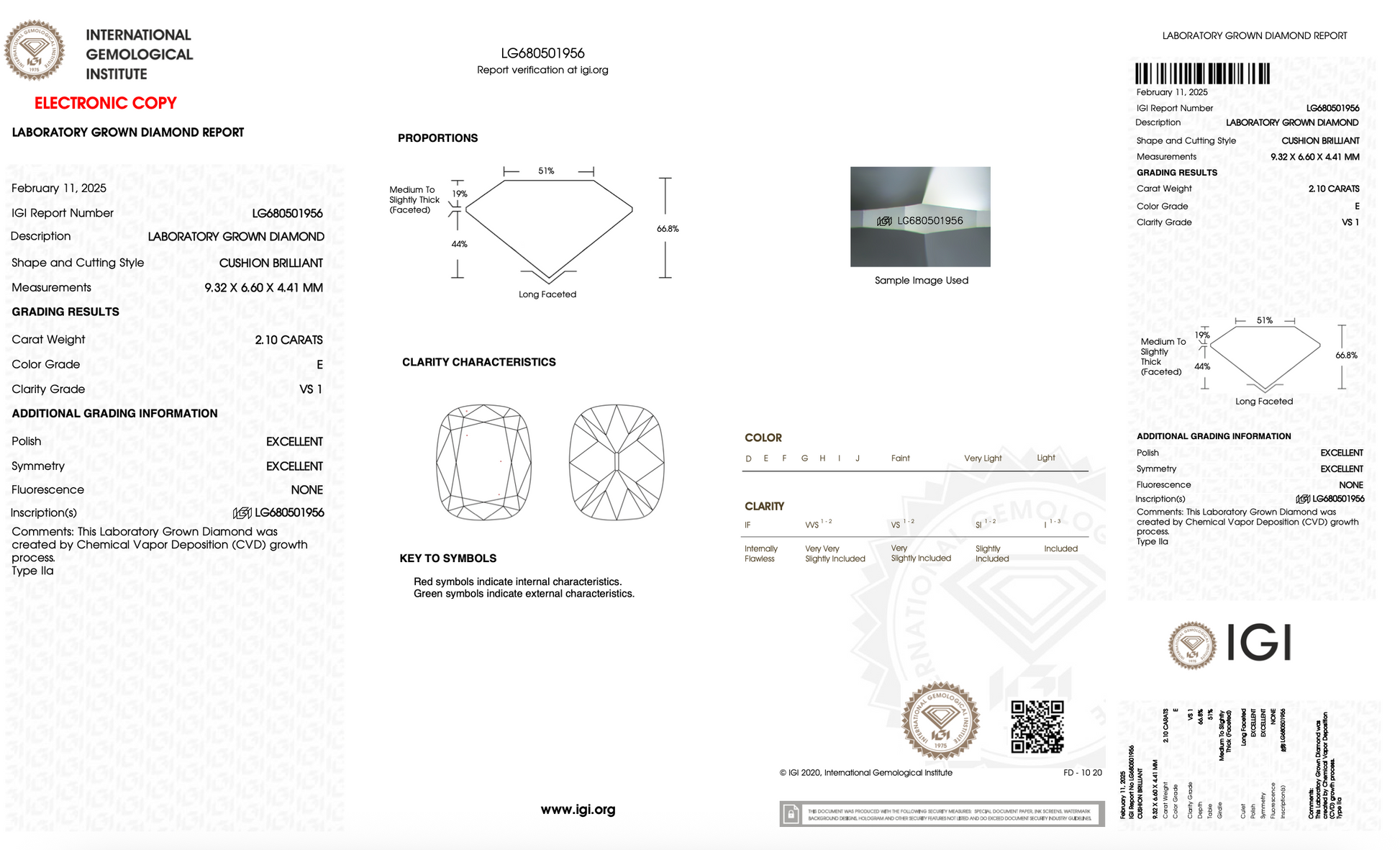 These antique-inspired earrings feature a matched pair of IGI certified old mine cut cushion lab-grown diamonds with a total weight of 4.22 carats, both with E color and VS1 clarity. Each diamond measures approximately 9.3 x 6.6 mm, showcasing the romantic faceting and pillowy shape that makes antique cuts so sought after.