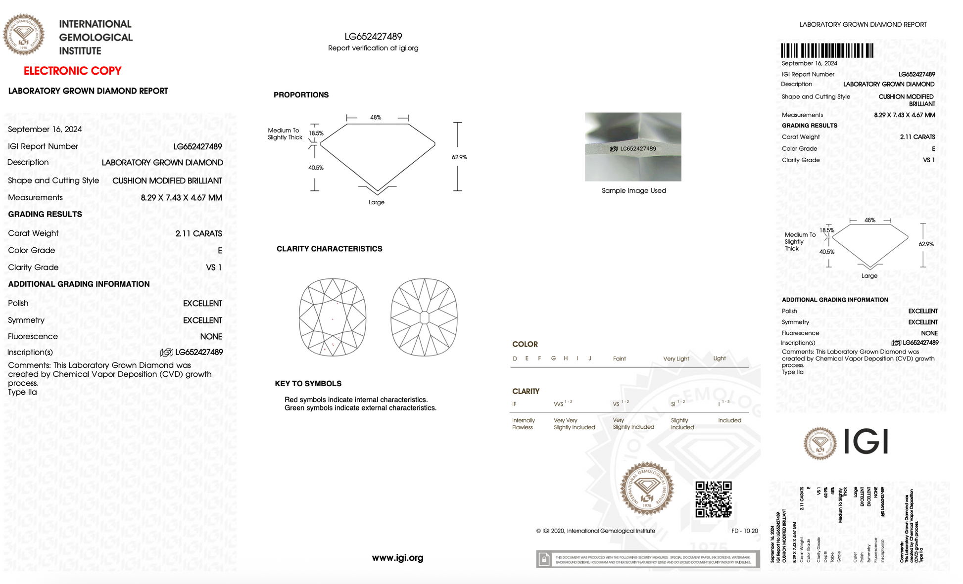 These antique-inspired earrings feature a matched pair of IGI certified old mine cut cushion lab-grown diamonds with a total weight of 4.29 carats, both with E color and VS1 clarity. Each diamond measures approximately 8.3 x 7.4 mm, showcasing the romantic faceting and pillowy shape that makes antique cuts so sought after.