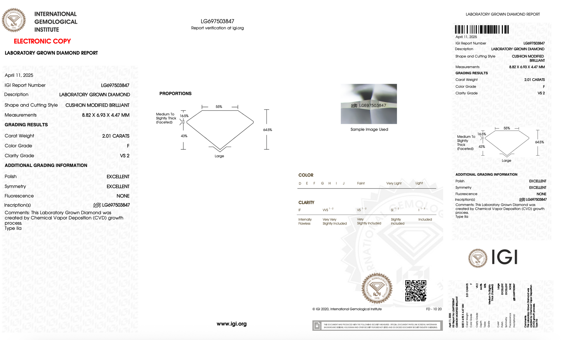 These antique-inspired earrings feature a matched pair of IGI certified old mine cut cushion lab-grown diamonds with a total weight of 4.02 carats. Each diamond measures approximately 8.8 x 6.9 mm, showcasing the romantic faceting and pillowy shape that makes antique cuts so sought after.