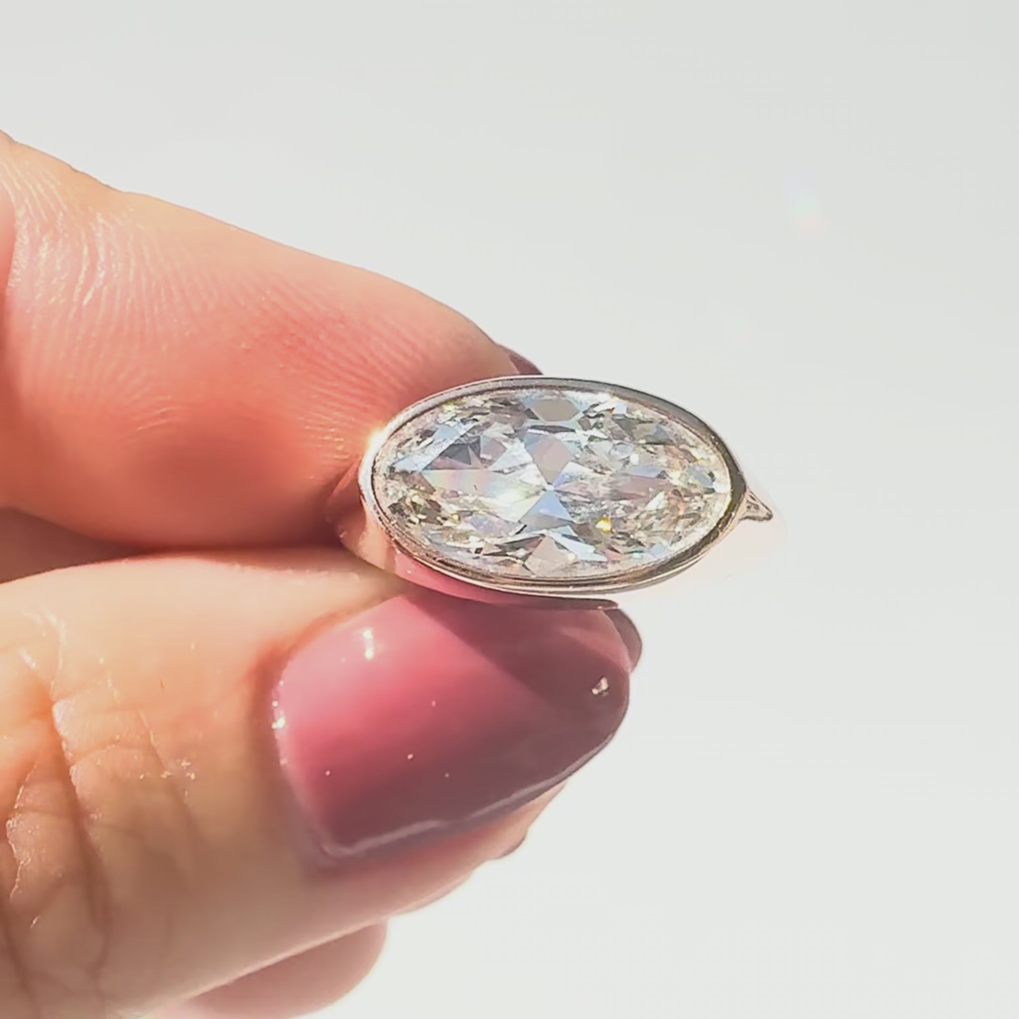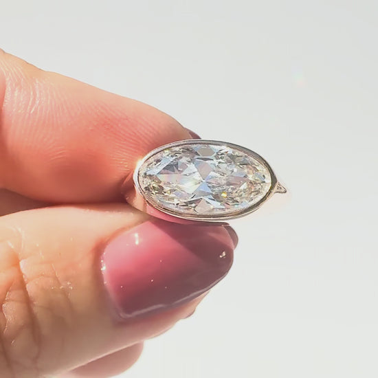 A funky reinterpretation of the classic signet, this ring features a 3.08ct E VS1 antique cut oval (moval, really) diamond set horizontally in a smooth, full bezel of 10K rose gold. The elongated silhouette (1.88 length-to-width ratio) makes those antique facets really stand out, while the east-west orientation gives striking finger coverage. With its clean lines and substantial presence, this ring balances vintage charm with everyday wearability.