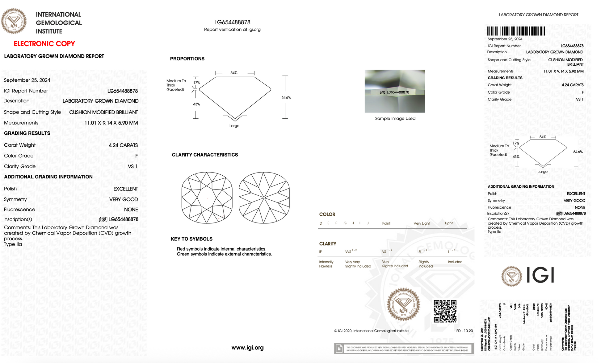 This one-of-a-kind ring centers on a custom-cut 4.24ct old mine cut cushion diamond, graded F VS1 by IGI (report 654488878). With its antique charm and modern precision, this diamond features rounded corners, a length-to-width ratio of 1.2, and a pinhole culet that gives it a distinctive vintage vibe. Measuring 11.01 x 9.14 x 5.9 mm with a visual spread closer to 5.44 carats, it offers exceptional finger coverage.